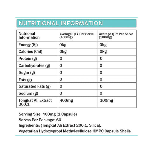 View full detailsTongkat AliServing Size - 400mg - 1 capsule Serves Per Container - 60Ingredients - (Tongkat Ali Extract 200:1, Silica). Vegetarian Hydroxypropyl Me...