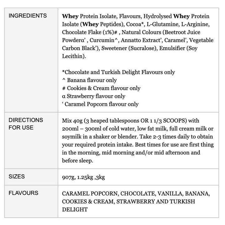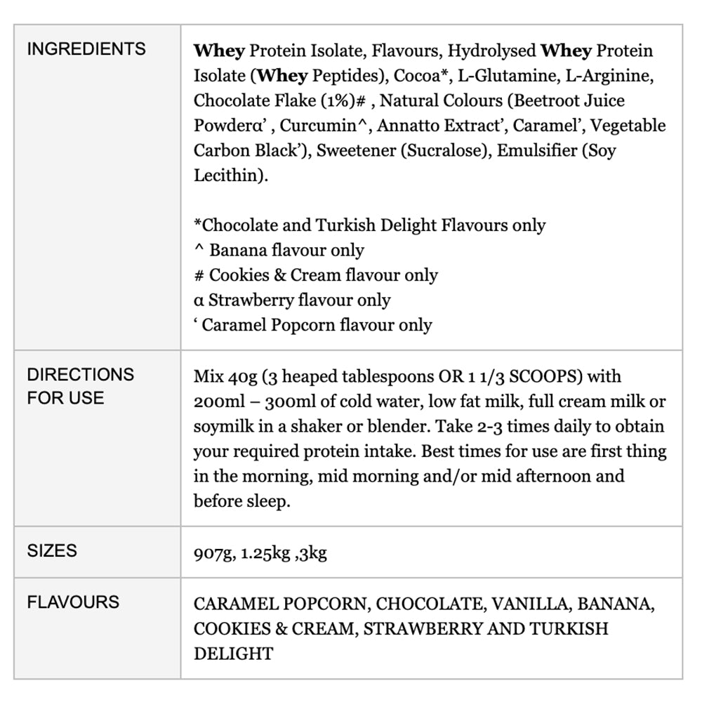 No Fillers or Stabilisers – nothing diluting this pure protein, just high quality protein and amino acids available for your body to digest at the fastest possible rate. Why pay for whey protein isolate and then slow its quick absorption with vegetable gums, thickeners and fillers?