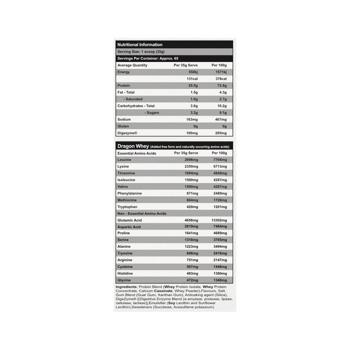 With the addition of the multi-enzyme complex DigeZyme consisting of gluten-free and GMO-free broad acting digestive enzymes, Dragon Whey is as gut friendly as whey proteins come!